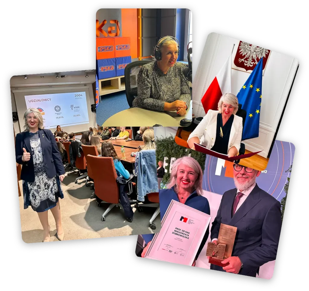 Prof. Małgorzata Dobrowolska od ponad 25 lat stoi na scenie i w salach szkoleniowych, gdzie spędziła ponad 47 700 godzin. Jej wykłady i warsztaty to praktyczne doświadczenie, które zmienia sposób myślenia i życie uczestników.